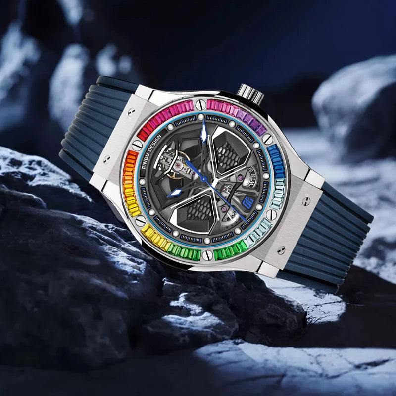 The Rainbow watch is a true statement piece, designed for those who embrace both sophistication and individuality. Its striking skeleton dial reveals the precision of its automatic self-wind movement, while the rainbow bezel adds a vibrant touch of modern luxury.