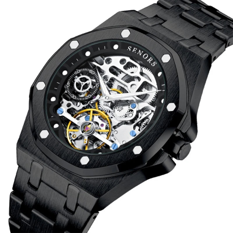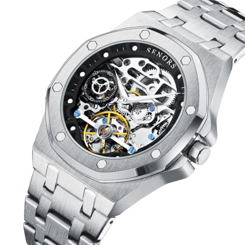 Experience the perfect blend of elegance and precision with the Tourbillon Skeleton Luxury Watch. Crafted in high-grade stainless steel, this timepiece showcases a bold skeleton dial that reveals the intricate self-winding automatic movement beneath.
